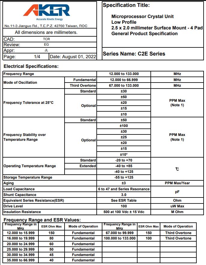 | C2E-16.000-12-3030-X-R | Aker晶振 | C2E | 16 MHz | ±30ppm | ±30ppm | 12pF |