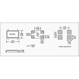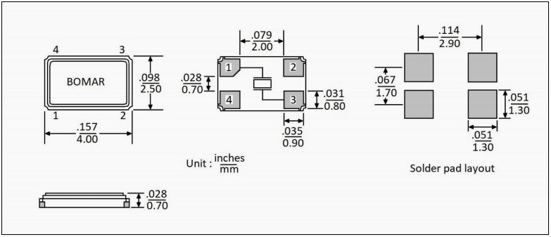 Bomar石英晶振,6G網絡傳輸晶振,BC41EFD120-24.000000四腳晶振,美國Bomar晶振公司,進口晶振,歐美晶振,SMD晶振,BC41晶振,小體積晶振,無源晶振,貼片晶振,四腳晶振,6G路由器晶振,6G信號接收器晶振,4025晶振,石英晶振,BC41是一款尺寸為4.0 x 2.5 x 0.70 mm的超微型陶瓷封裝SMD型晶體,采用四焊片設計。0.70mm的高度和50 MHz的基頻使BC41系列成為眾多應用的絕佳選擇。可能的應用包括藍牙、便攜式個人電腦、個人電腦外圍設備、移動通信和無線通信。