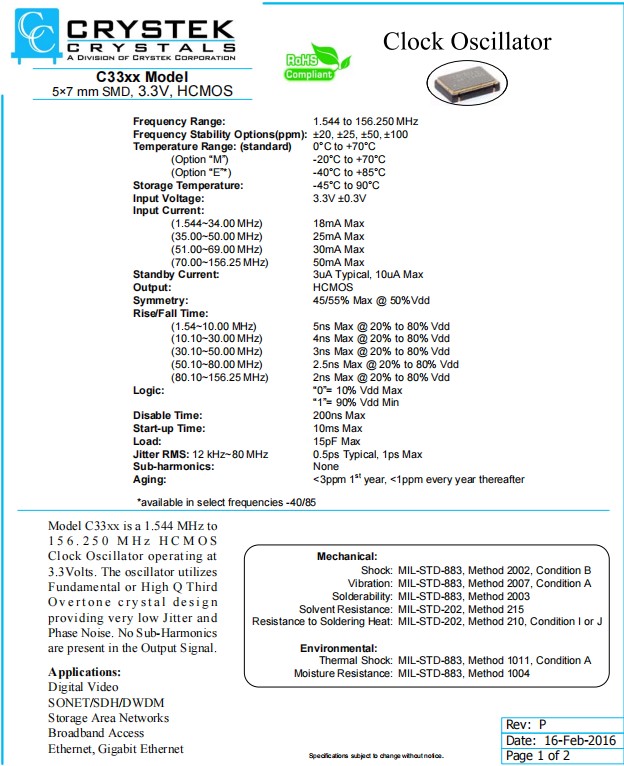 | C3390-16.384 | Crystek Crystal | C33 | XO (Standard) | 16.384MHz |