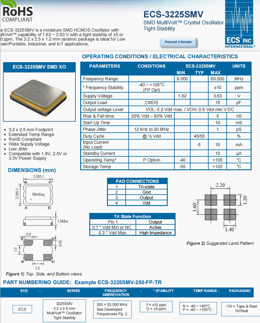 ECS-3225SMV-250-FP-TR晶振,進口ECS有源晶振,醫(yī)療設備晶振,美國ECS晶振公司,伊西斯無源晶振,ECS-3225SMV-250-FP-TR晶振,25MHz晶振,3225晶振,超小型晶振,四腳貼片晶振,石英晶體諧振器,美國進口晶振,高精度晶振,耐高溫晶振,汽車電子晶振,工業(yè)設備晶振,物聯(lián)網(wǎng)晶振,COTS晶振.ECS-3225SMV是一款微型SMD HCMOS振蕩器,MultiVolt™能力為1.62 ~ 3.63 V,穩(wěn)定性為±5或±10 ppm。3.2 x 2.5 x 1.2 mm陶瓷封裝是低功耗/便攜式,工業(yè)和物聯(lián)網(wǎng)應用的理想選擇。