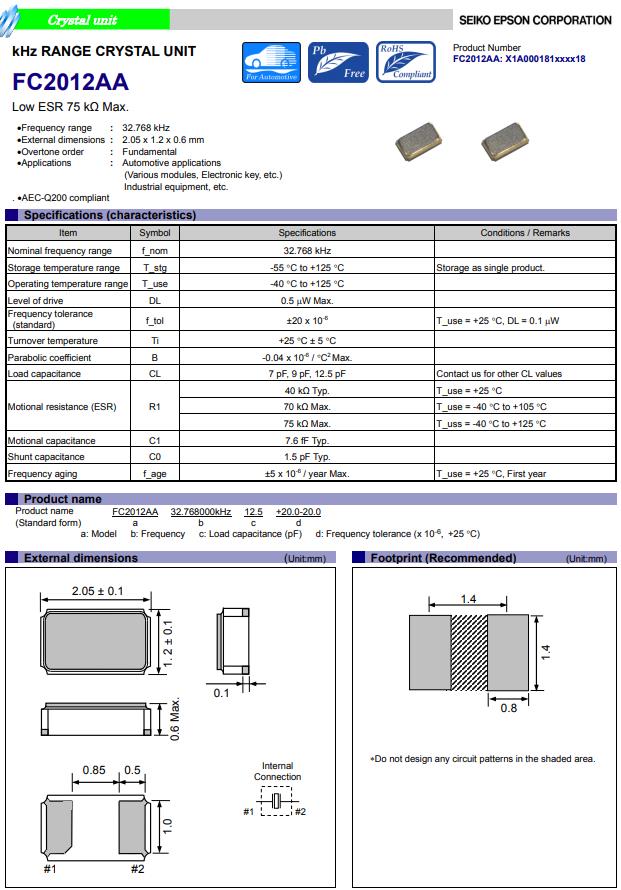 | X1A000181000200 | 2.05 x 1.2 x 0.6 mm | FC2012AA | 32.768kHz | 9 pF | -40 to +125 °C |