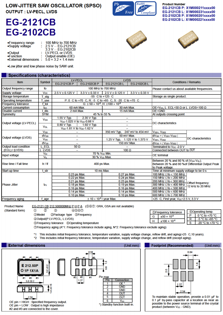 | X1M0002010005 | EG-2102CB | 212.500000 MHz | 5.00 x 3.20 x 1.40 mm | LV-PECL | 2.970 to 3.630 V | -20 to 70 °C |