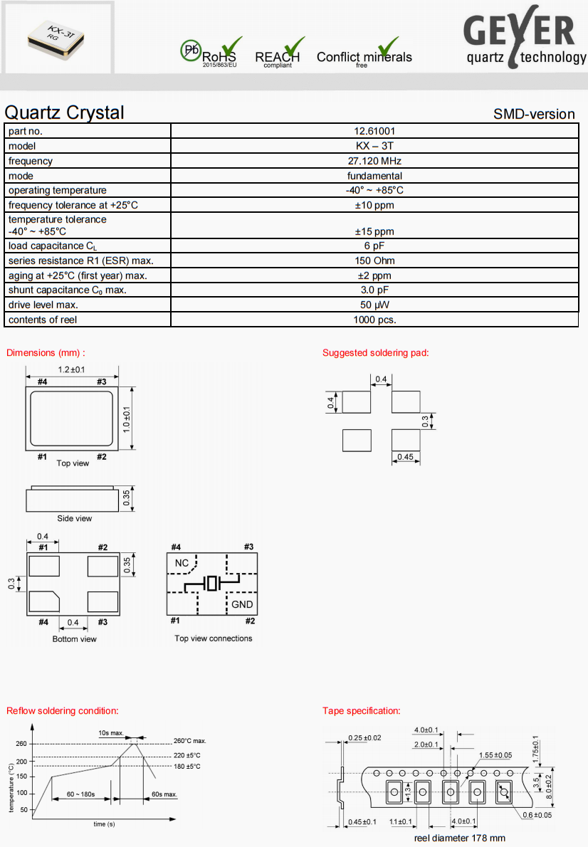 | 12.86520 | Geyer晶振 | KX-6 | 27 MHz | ±50ppm | ±30ppm | 10pF |