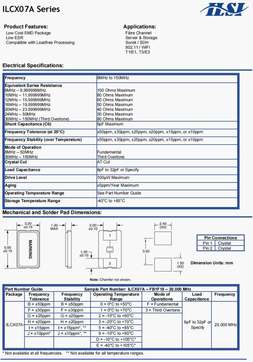 ILSI環保無鉛晶振,ILCX07A二腳晶振,ILCX07A-FB1F12- 18.432 MHz移動電話晶振