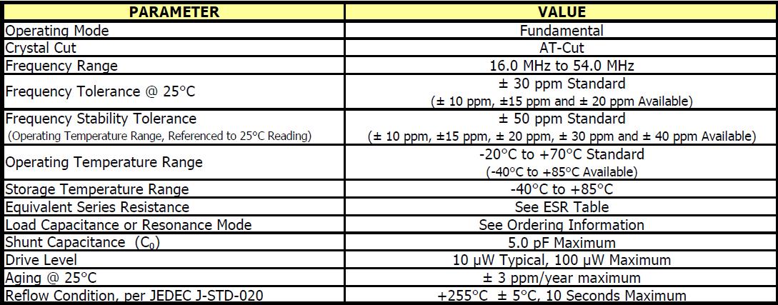 標準2.5 x2.0mm表面山足跡,在溫度和頻率穩定,開車水平,基本晶體設計,頻率范圍16 - 54 MHz,頻率公差,±30 ppm標準,(±10 ppm,±15 ppm和±20 ppm可用),頻率穩定度,±50 ppm標準,(±20±±10日,15日,±30和40±ppm),操作溫度為-40°C + 85°C,磁帶和卷軸包裝,eia - 481 - 2兼容,符合RoHS /綠(6/6).