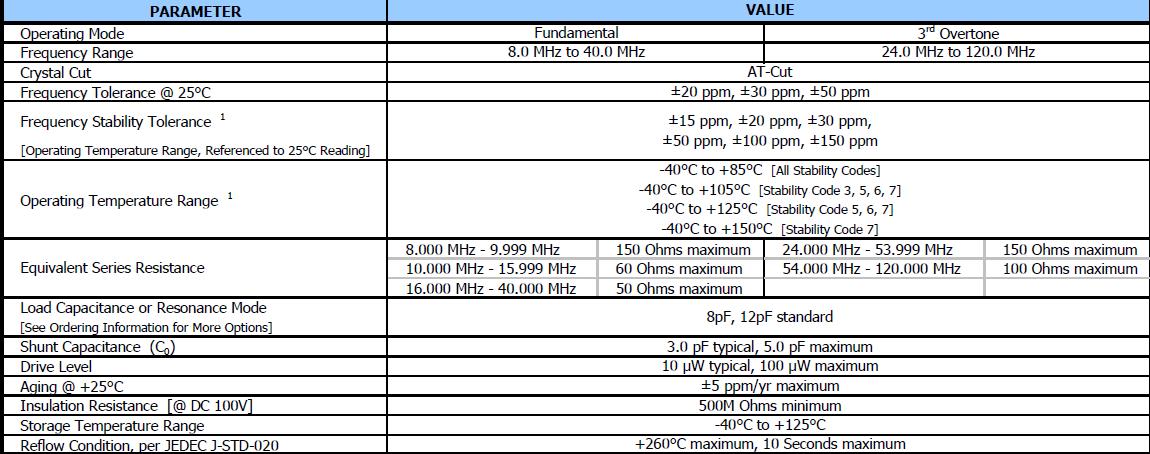 AEC-Q200兼容,標(biāo)準(zhǔn)5.0毫米x 3.2毫米玻璃密封包,基本晶體設(shè)計(jì),頻率范圍8 - 40 MHz基本,24 - 120 MHz第三泛音頻率公差;±20 ppm,±30 ppm和±50 ppm,頻率穩(wěn)定度、參考訂購信息,操作溫度,-40°C + 125°C標(biāo)準(zhǔn),磁帶和卷軸包裝標(biāo)準(zhǔn),eia - 481,通過無鉛認(rèn)證符合歐盟指令2011/65 /歐盟,無鉛終止完成,豁免7(c)-我,電氣和電子元件含鉛玻璃(Pb).