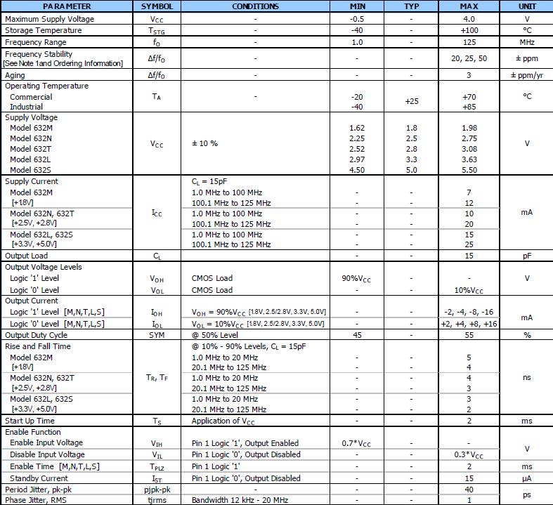 標準3.2毫米x 2.5毫米4-Pad表面安裝包,HCMOS輸出,根本和第三泛音晶體的設計,頻率范圍1 - 125 MHz,頻率穩定度±50 ppm標準,±25 ppm和±20 ppm,操作電壓+ 1.8 vdc,+ 2.5 vdc,+ 2.8 vdc,+ 3.3 vdc或+ 5.0伏直流,操作溫度為-40°C + 85°C,允許輸出標準,磁帶和卷軸包裝標準,eia - 418