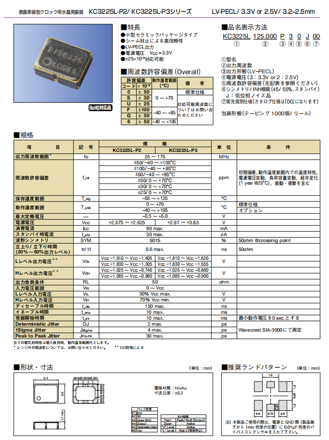 | KC3225A106.250C30E00 | AVX Corp/Kyocera Corp | KC3225A-C3, Kyocera | 106.25MHz | 3.3V | -10°C ~ 70°C |