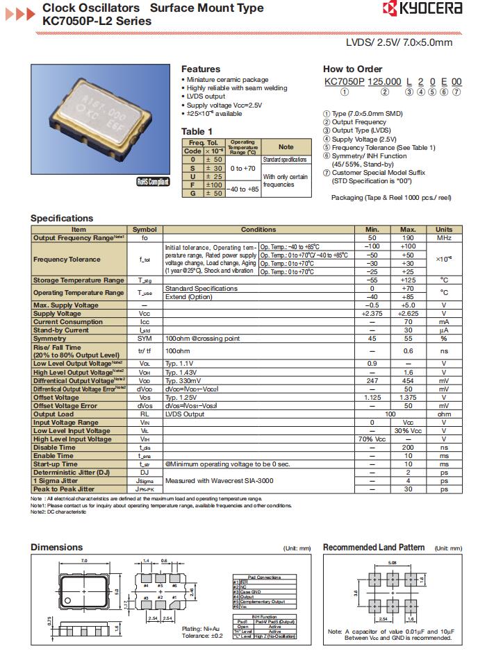 | KC7050P125.000L30E00 | AVX Corp/Kyocera Corp | KC7050P-L3 | 125MHz | 3.3V | 0°C ~ 70°C |