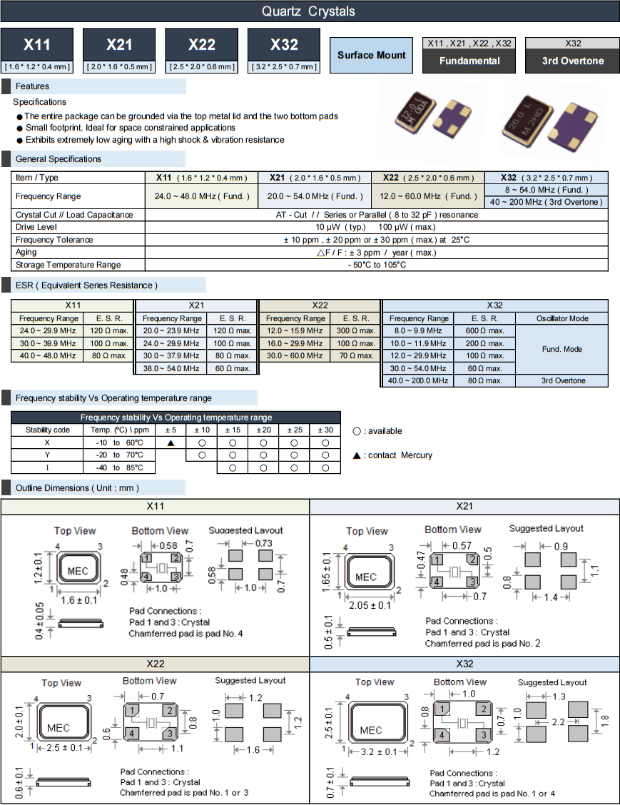 | 項目/型號 | X11 ( 1.6 * 1.2 * 0.4 mm ) | X21 ( 2.0 * 1.6 * 0.5 mm ) | X22 ( 2.5 * 2.0 * 0.6 mm ) | X32 ( 3.2 * 2.5 * 0.7 mm ) |