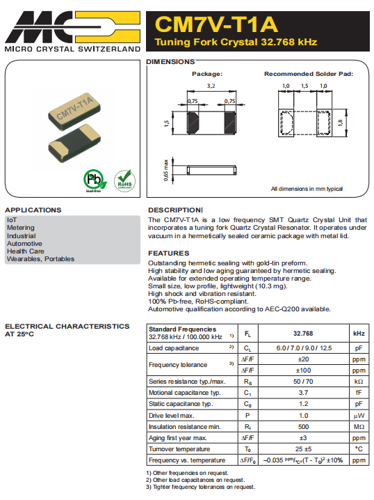 CM7V-T1A-32.768kHz-12.5pF-20PPM-TA-QC|瑞士微晶晶振|3215mm貼片晶振,瑞士微晶晶振,CM7V-T1A無源晶振,CM7V-T1A-32.768kHz-12.5pF-20PPM-TA-QC晶振,3215mm晶振,石英貼片晶振,小體積晶振,32.768KHZ晶振,負載12.5pf,工作溫度-40~85°C,可穿戴設備晶振,便攜式設備晶振,物聯網晶振,車載晶振,衛生保健應用晶振,工業設備晶振.