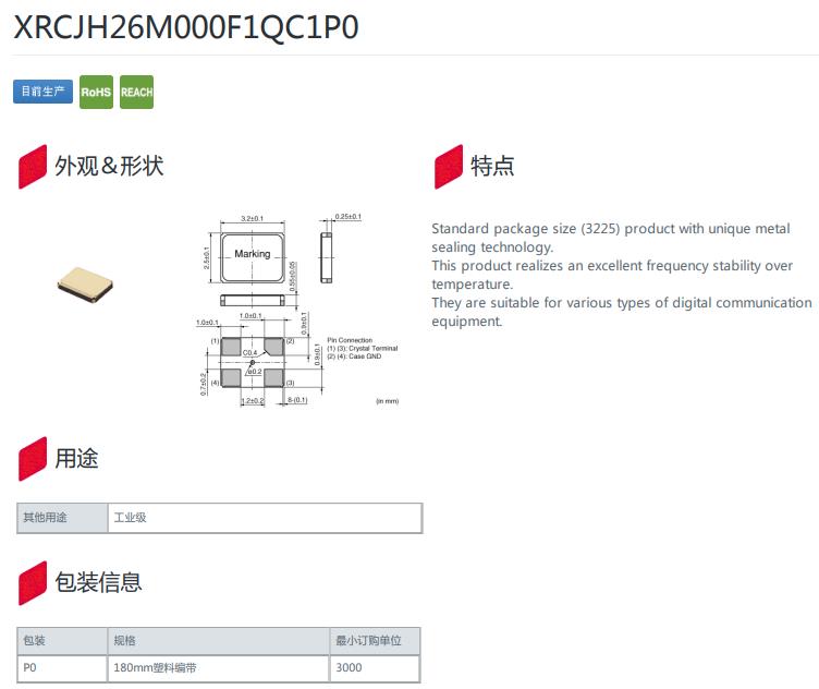 XRCJH26M000F1QC1P0|26MHz|-30~85℃|8pf|3225,編碼XRCJH26M000F1QC1P0,型號為TAS-3225J,頻率26MHz,工作溫度-30~85℃,負載8pf,尺寸大小3225mm,數字通信設備晶振,5G室外基站晶振,工業設備晶振,無線通訊設備晶振.