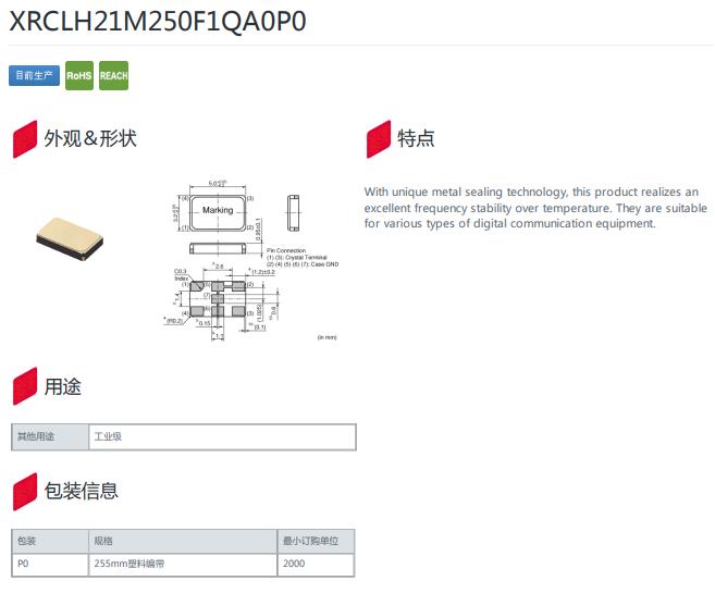 - 產品描述:XRCLH21M250F1QA0P0,頻率21.25MHz,工作溫度-30~85℃,尺寸5032mm,負載8pf,高精度晶振,數字通信設備晶振,測量儀器晶振,微處理器晶振,數碼音影系統晶振.