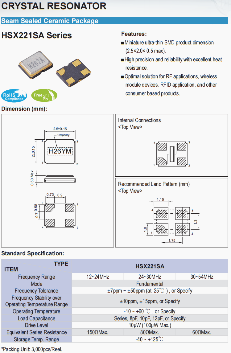 | X2B012000DC1H-X | 加高晶振 | HSX221SA | 12 MHz | ±20ppm | 12pF | -10°C ~ 60°C |