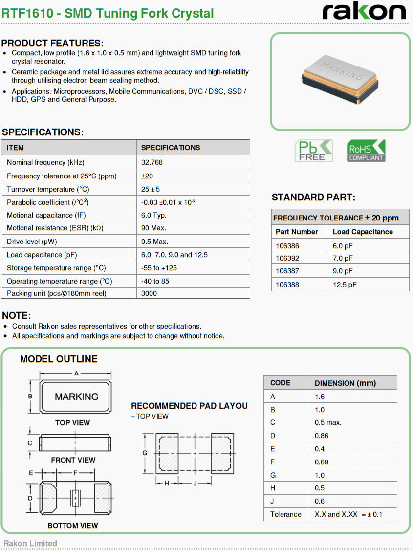 Rakon瑞康晶振,6G信號接收器晶振,RTF1610二腳晶振,新西蘭瑞康晶振,Rakon晶振,進口晶振,歐美晶振,6G信號接收器晶振,二腳晶振,32.768K晶振,石英晶振,貼片晶振,無源晶振,緊湊,低輪廓(1.6 x 1.0 x 0.5毫米)和輕量級SMD音叉晶體諧振器。陶瓷封裝和金屬蓋通過電子束密封方法確保極高的精度和高可靠性。應用:微處理器,移動通信,DVC / DSC, SSD /HDD, GPS和通用。