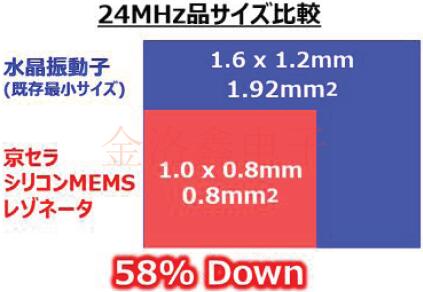 2.小型化的實現(xiàn) 對于24MHz產(chǎn)品,ESR特性通常要求為60ohm或更小,并且由于其物理特性,石英的尺寸限制為1.6×1.2mm.京瓷的硅MEMS諧振器通過其獨特的元件設計技術以1.0x0.8mm的小尺寸實現(xiàn)了所需的特性.面積比減小了58%.超小型的MEMS晶振模塊未來有可能會是主方向,但是石英晶振也會是不可或缺的,畢竟它的成本更低,而且性能方面也有優(yōu)勢,無論是硅晶和石英,都是晶振主要的原材料.