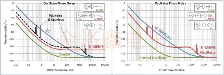 最后,對于三種類型的振蕩器,使用晶體單元作為振蕩源的基本諧波振蕩器,使用PLL電路設計和Si諧振器的Si-MEMS振蕩器,其相位噪聲特性相對于輸出的趨向圖5的右側顯示了作為振蕩源的LC振蕩器(使用LC振蕩作為振蕩源).