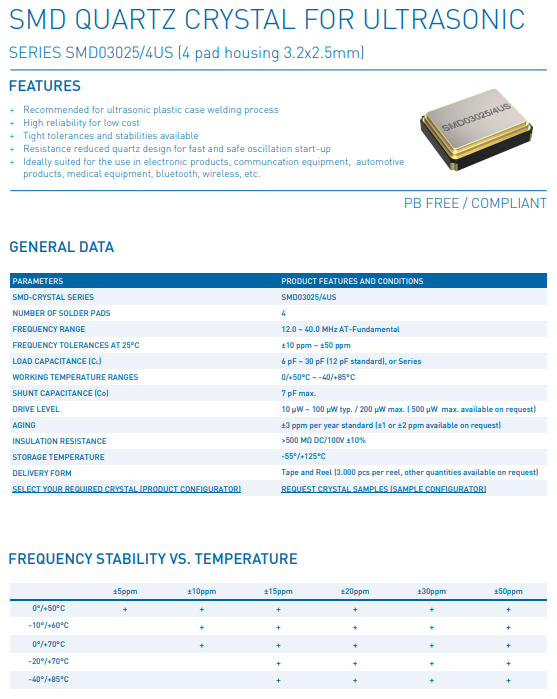 適用于超聲波的SMD03025/4US系列的SMD石英可以用超聲波焊接和清洗。為此,該石英(其石英諧振器具有特殊的固定超聲波極限)被設(shè)計用于15 KHz、20 KHz、35 KHz和40 KHz的超聲波頻率。