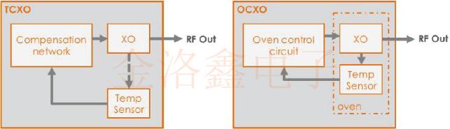 TCXO調整振蕩器的頻率,以補償由于溫度變化而發生的變化.為此,TCXO的主要元件是壓控晶體振蕩器(VCXO晶振).如下圖所示,該電路連接到檢測溫度并向振蕩器施加小的校正電壓的電路. 構成整個溫度控制振蕩器的有5種不同的元器件:
