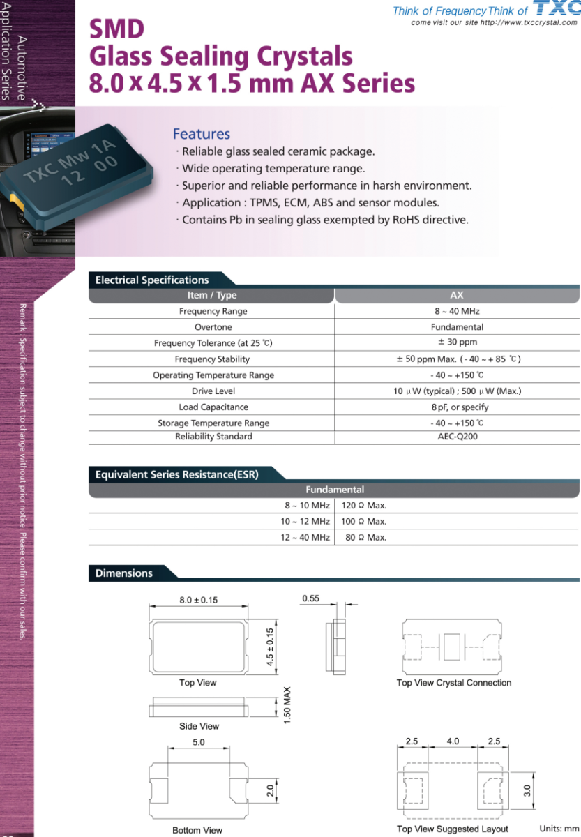 汽車導航系統晶振,TXC臺產晶體,AX-33.333MAGQ-T晶振,臺灣TXC晶振公司,汽車級晶振,無源晶振,車載USB晶振,高精度晶振,耐高溫晶振,高品質晶振,臺產晶振,8045晶振,貼片晶振,陶瓷面晶振,二腳晶振,AX系列貼片玻璃密封晶體,8.0 x4.5 x 1.5毫米。特點.可靠的玻璃密封陶瓷封裝。.工作溫度范圍寬。.惡劣環境下性能優越、可靠。·應用領域:TPMS,ECM,ABS和傳感器模塊。-不受RoHS指令限制的密封玻璃中含有鉛