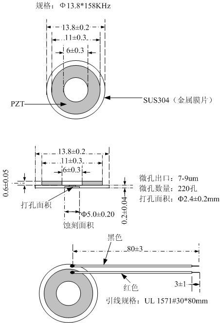 - 產品描述:霧化片規格應用此規格超聲波霧化片主要應用在微量霧化設備中。2.型號LUO-13.8mm158-E3.規格說明3.1外形圖見圖紙最后一頁No.LUO-13.8mm158-E3.2電氣參數3.2.1諧振頻率(fr)fr=158kHz5kHz3.2.2諧振阻抗(Ro)Ro=max.1803.2...