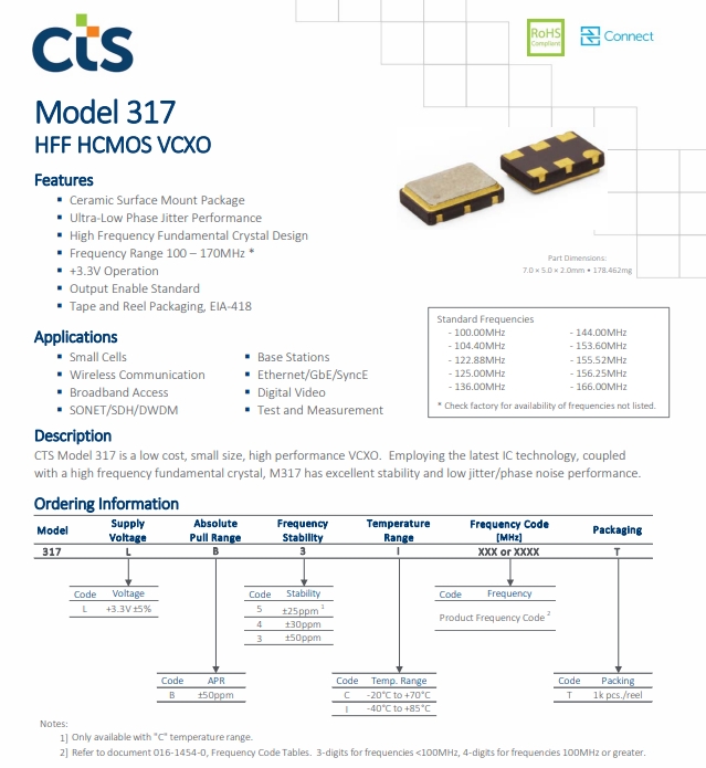 | 317LB5I1250T | CTS | 317 | VCXO | 125 MHz | HCMOS | 3.3V | ±25ppm |