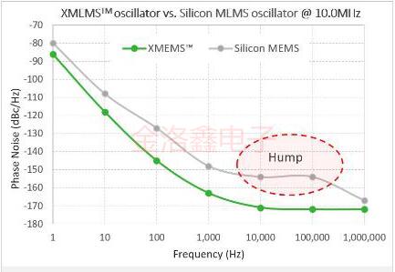 XMEMS™技術可以提供最佳的晶振相位噪聲性能,而不會出現通常在硅MEMS振蕩器相位噪聲性能圖中常見的鎖相環引起的相位噪聲'駝峰'.