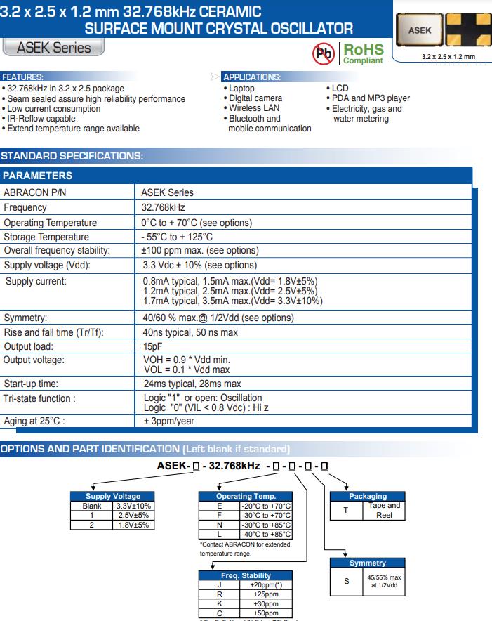 | ASEK2-32.768KHZ-LRT | Abracon晶振 | ASEK | XO (Standard) | 32.768kHz | 1.8V | -40°C ~ 85°C |