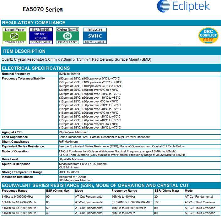 EA5070PA20-6.000MTR Ecliptek石英晶體 QUARTZ CRYSTAL RESONATOR