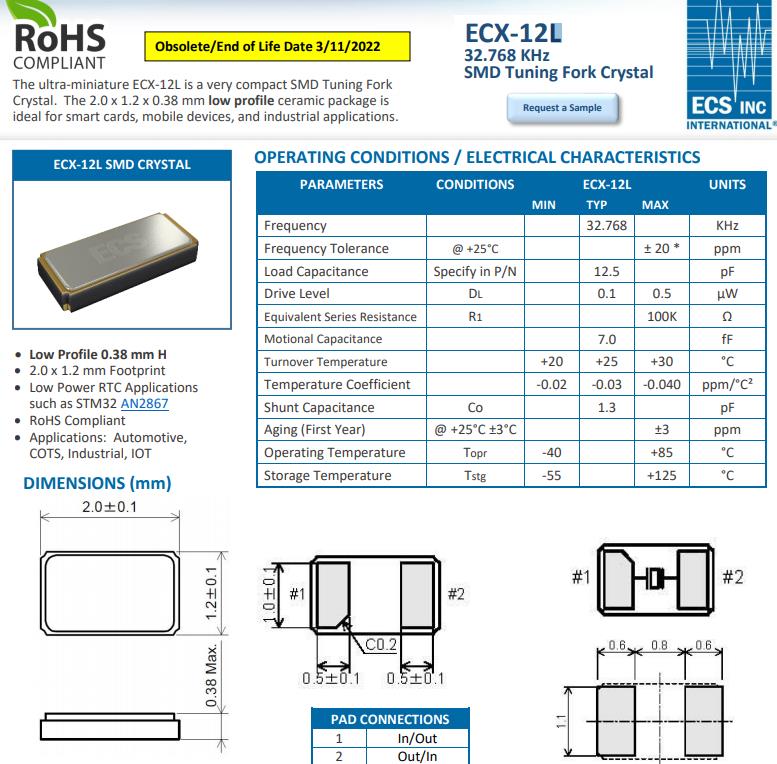 | ECS晶振 | ECX-12 | kHz Crystal (Tuning Fork) | 32.768kHz | -40°C ~ 85°C |