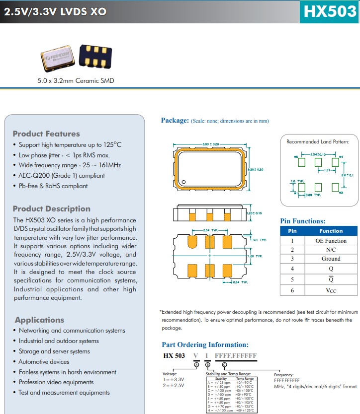 HX503 25 ~ 100 5.0x3.2x1.2 25至162 (1.8V/2.5V/3.3V) <1 LVDS 3.32.5 6 陶瓷縫 2.5V/3.3V、5.0x3.2mm、高溫LVDS晶體振蕩器