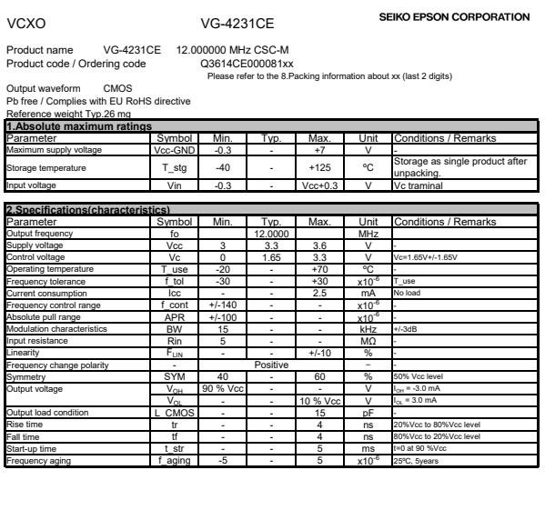 | Q3614CE00008100 | VG-4231CE | 12.000000 MHz | 3.20 x 2.50 x 1.05 mm | CMOS | 3.000 to 3.600 V | 1.65 +/-1.65V | +/-100 ppm | +/-140 ppm | -20 to 70 °C | |