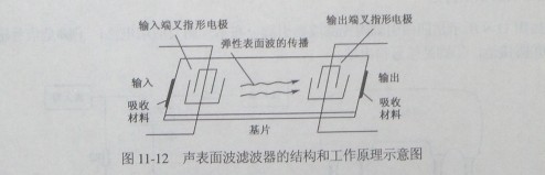 如圖11-12所示是聲表面波濾波器的結構和工作原理示意圖。在輸入端和輸出端設有叉指形電極。當給輸入端叉指形電極加上交變電信號時,在輸入信號的交變電場作用下,由于晶體的壓電效應,在基片表面激起機械振動,形成聲表面波。