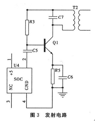 如圖3,無線充電器主振電路采用2 MHz有源晶振作為振蕩器。有源晶振輸出的方波,經過二階低通濾波器濾除高次諧波,得到穩定的正弦波輸出,經三極管13003及其外圍電路組成的丙類放大電路后輸出至線圈與電容組成的并聯諧振回路輻射出去.為接收部分提供能量。