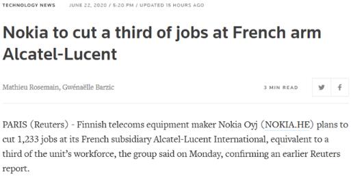 這次諾基亞一次性裁員1000多人,也會間接給供應鏈造成一定的影響,業(yè)務量減少訂單同樣也會變少.諾基亞這一裁員聲明公布于各國積極部署5G移動網絡之際,與此同時,這則聲明在疫情發(fā)展未見明朗的法國引發(fā)了一定程度的政治反響,因為諾基亞在5年前買下Alcatel-Lucent時,曾承諾保留工作崗位.據悉,承諾保留工作崗位這一條件加速了法國監(jiān)管機構對該項收購交易的審批.