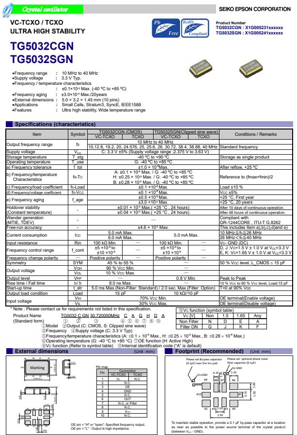 | X1G005231001900 | TG5032CGN | 10.000000 MHz | 5.00 x 3.20 x 1.45 mm | CMOS | 3.135 to 3.465 V | +/-1.0 ppm | -40 to ++85 °C |