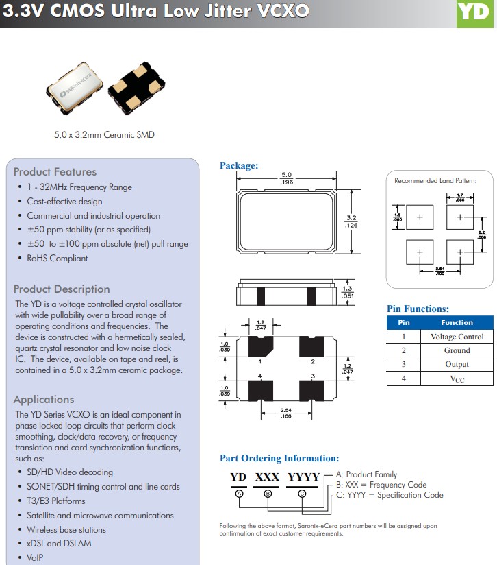 亞陶晶振YD系列是一種壓控晶體振蕩器,在廣泛的工作條件和頻率范圍內(nèi)具有廣泛的可拉性。該器件由密封的石英晶體諧振器和低噪聲時(shí)鐘IC構(gòu)成。該器件采用卷帶包裝,采用5.0x 3.2mm 陶瓷封裝。YD系列VCXO晶振是執(zhí)行時(shí)鐘平滑、時(shí)鐘/數(shù)據(jù)恢復(fù)或頻率轉(zhuǎn)換和卡同步功能的鎖相環(huán)電路中的理想組件。亞陶晶振YD系列由密封的石英晶體諧振器和低噪聲時(shí)鐘IC構(gòu)成,YNWMAX153,5032mm晶振,有源晶振