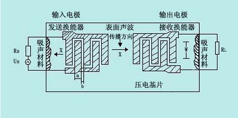 這種濾波器的基片是由壓電材料(如鈮酸鋰或石英晶體)制成,在基片上蒸鍍兩組“叉指電極”,一般由金屬薄膜用光刻工藝刻成。左側接信號源的一組稱為發送換能器,右側接負載的一組稱為接收換能器,圖中a、b分別為電極寬度和極間距離,W為相鄰叉指對的重疊長度,稱為“叉指孔徑”。當交變的電信號us加到發送換能器的兩個電極上時,通過反壓電效應,基片材料就會產生彈性形變,這個隨信號變化的彈性波,即“聲表面波”,它將沿著垂直于電極軸向(圖中x方向)向兩個方向傳播,一個方向的聲表面波被左側的吸聲材料吸收,另一方向的聲表面波則傳送到接收換能器,由正壓電效應產生了電信號,再送到負載RL。但叉指換能器的形狀不同時,濾波器對不同頻率信號的傳送與衰減能力就會不一樣。