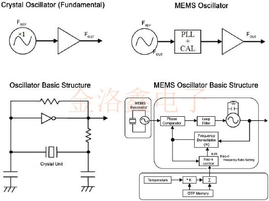 晶體振蕩器使用石英晶體基準和簡單的振蕩器電路,MEMS振蕩器使用硅諧振器作為振蕩源,并需要PLL電路來校正頻率以達到制造公差和溫度系數.正如這些基本結構所示,晶體振蕩器是簡單構建的高質量時鐘.相反,MEMS振蕩器具有復雜的結構,該結構由MEMS諧振器,分數nPLL和溫度補償網絡組成.他們還需要進行制造校準才能正確運行.