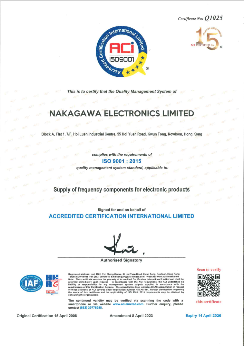 NAKAGAWA ELECTRONICS LIMITED (NKG晶振)致力于提供高質量的產(chǎn)品,并因此維護質量和管理體系,以確保能夠保證這一點。不僅對我們的客戶,而且對我們自己的員工和社區(qū),我們以最高的法律和道德標準協(xié)調我們的所有活動,履行社會責任。我們公司的運作是參照相關的企業(yè)管治準則和包括EICC行為準則在內的國際標準來制定和更新的。中川電子有限公司(NKG)香港總部以ISO 9001為基礎運作生產(chǎn)石英晶體諧振器,并定期接受審核。您可以在這里查看證書。我們的生產(chǎn)基地除了擁有兩個體系資質外,還擁有更先進的設置,涵蓋了TS 16949和全面的健康和安全程序(基于OHSAS要求)。除了強制性的內部XRF測試(基于QC080000模型)外,工廠還運行了一個擴展系統(tǒng),以確保我們的產(chǎn)品符合環(huán)境要求。