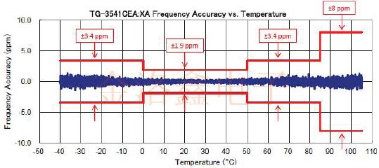 通過使用愛普生的數字溫度補償晶體振蕩器(DTCXO)技術,愛普生的TG-3541CEA在-40~+85℃范圍內達到<±3.4ppm的精度,在+105,