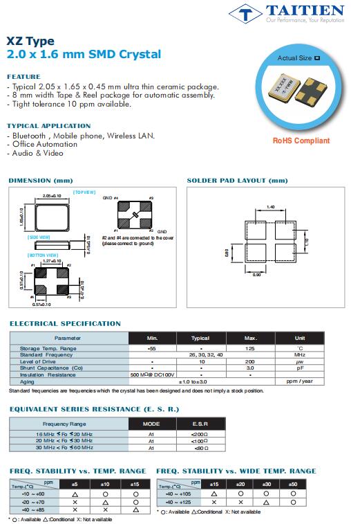| XZAEELNANF-26.000000 | Taitien晶振 | XZ | 26MHz | -40°C ~ 85°C | 0.081" L x 0.065" W (2.05mm x 1.65mm) |